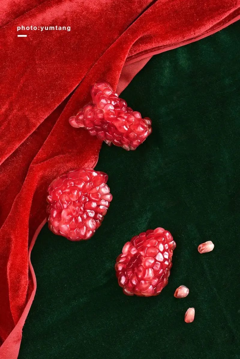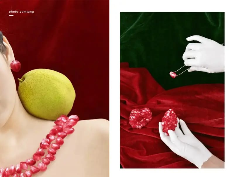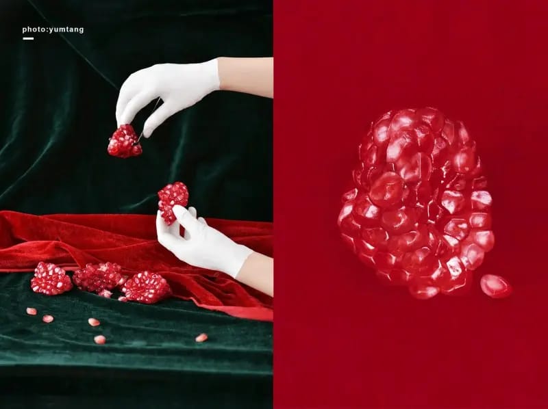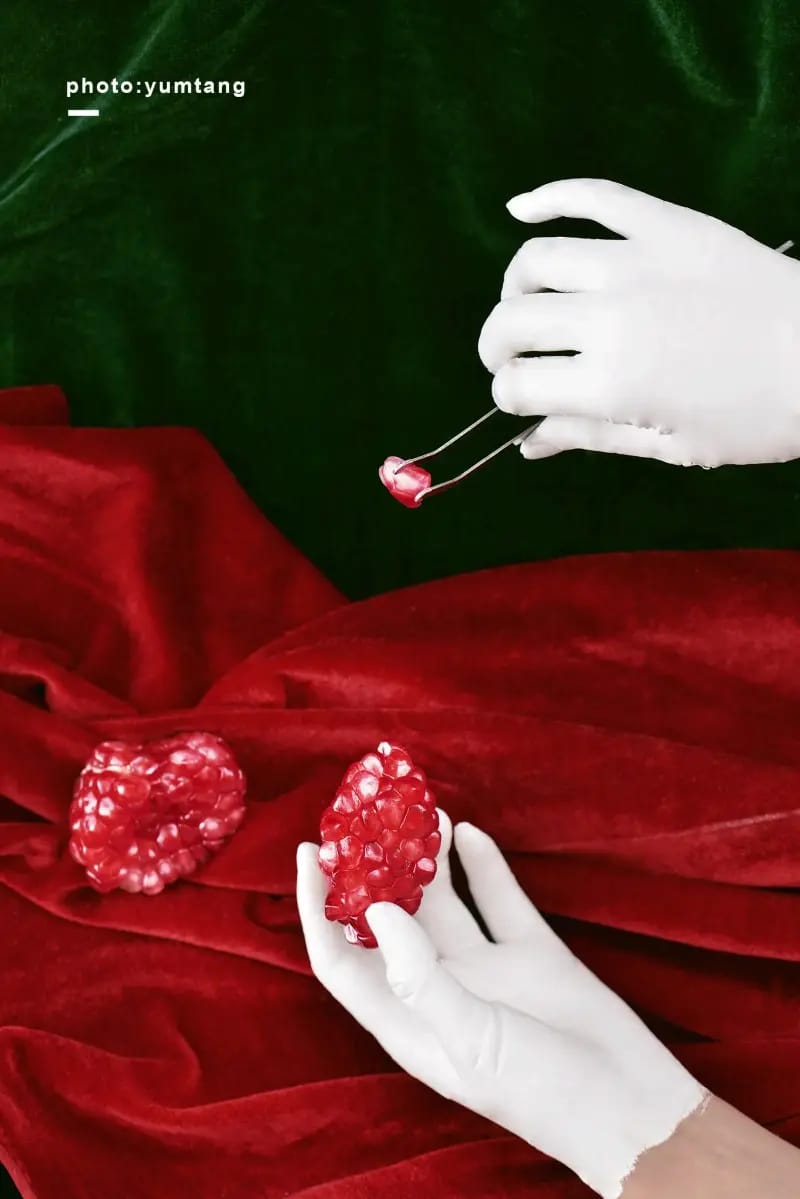 One series we’re particularly impressed with is Pomegranate, where she treats the seeds like jewelry, complete with the white glove treatment.