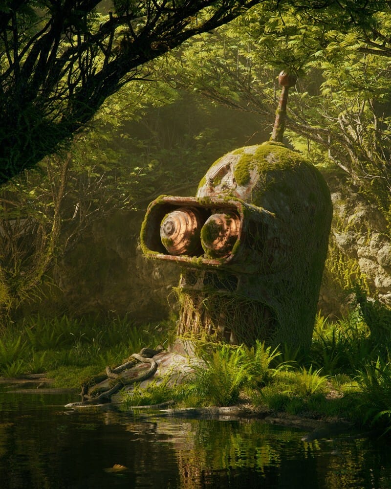 Artist Filip Hodas has an ongoing series where he explores the decaying remnants of pop culture icons. These include Futurama’s Bender, Pacman, Hello Kitty, and many more. The icons are beautifully rendered as robotic-like droids or machines, but long since dead, and decaying amongst swamps and abandoned fields. Covered in moss, dirt, and graffiti, Hodas lovingly creates a world that feels dystopian, but also peaceful and calm.