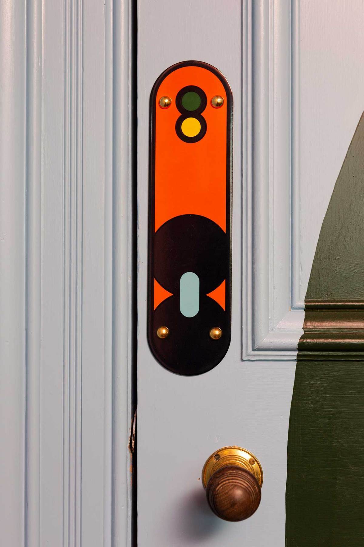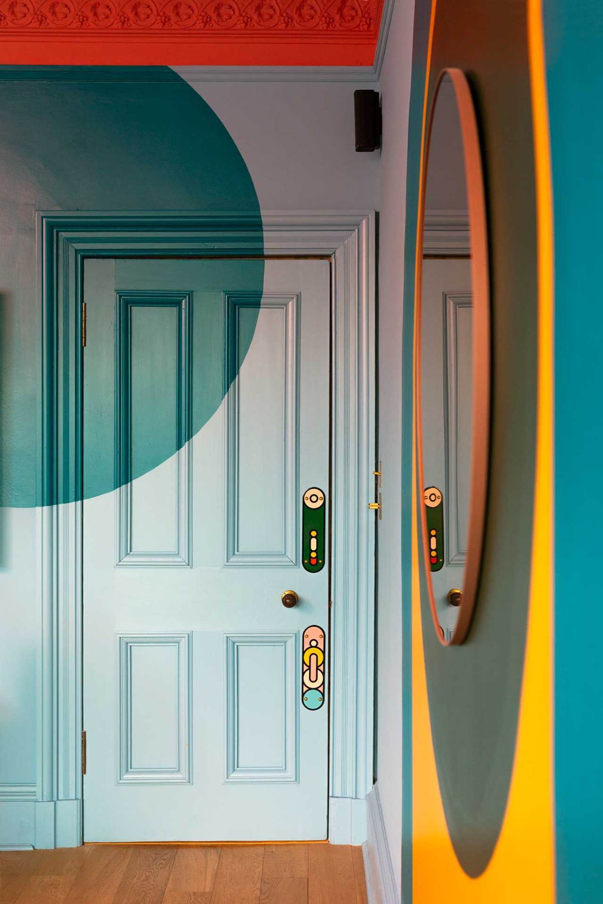 Every detail seems to be touched, from sculptural elements on the ceiling to decorative door plates, to color block patterns on the walls and fireplace.