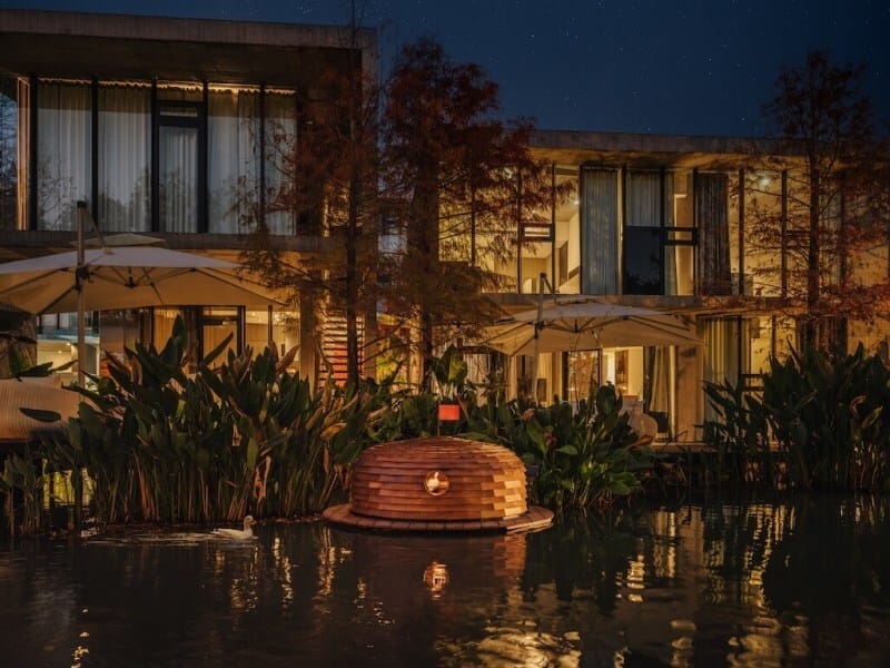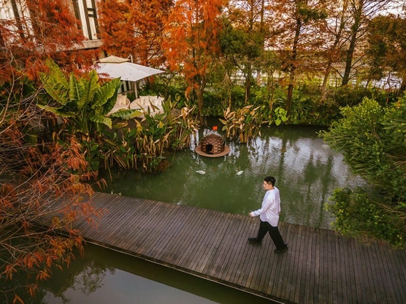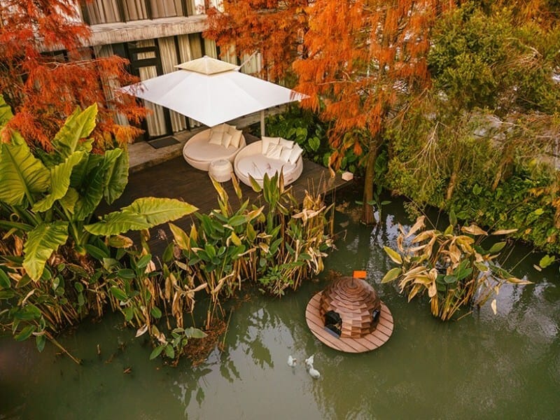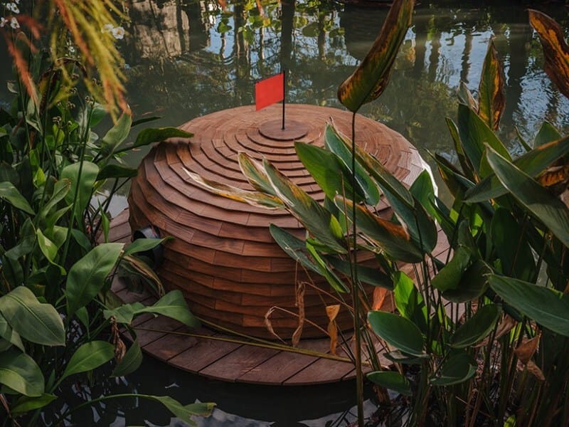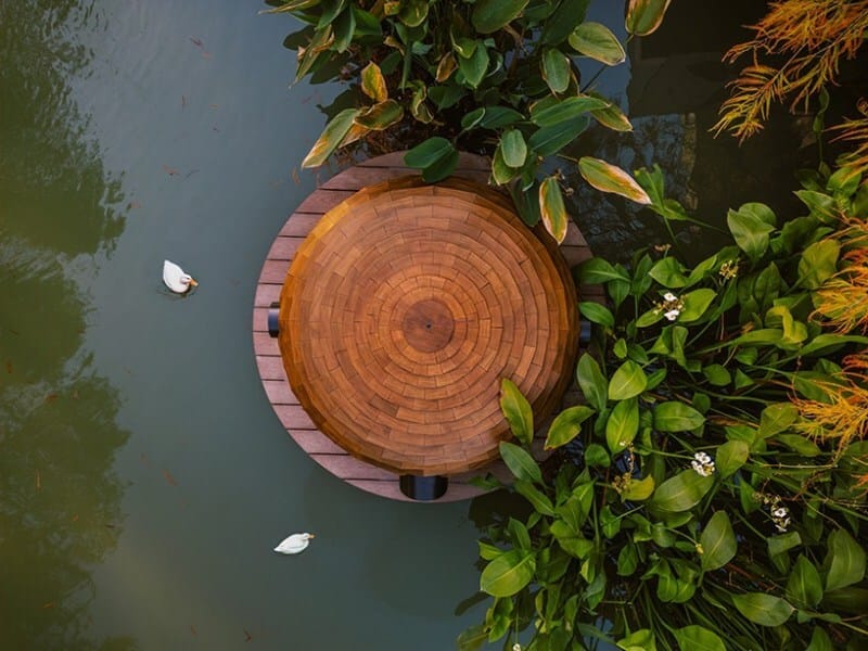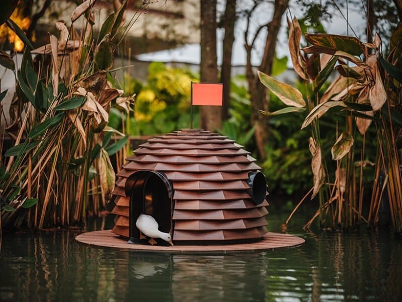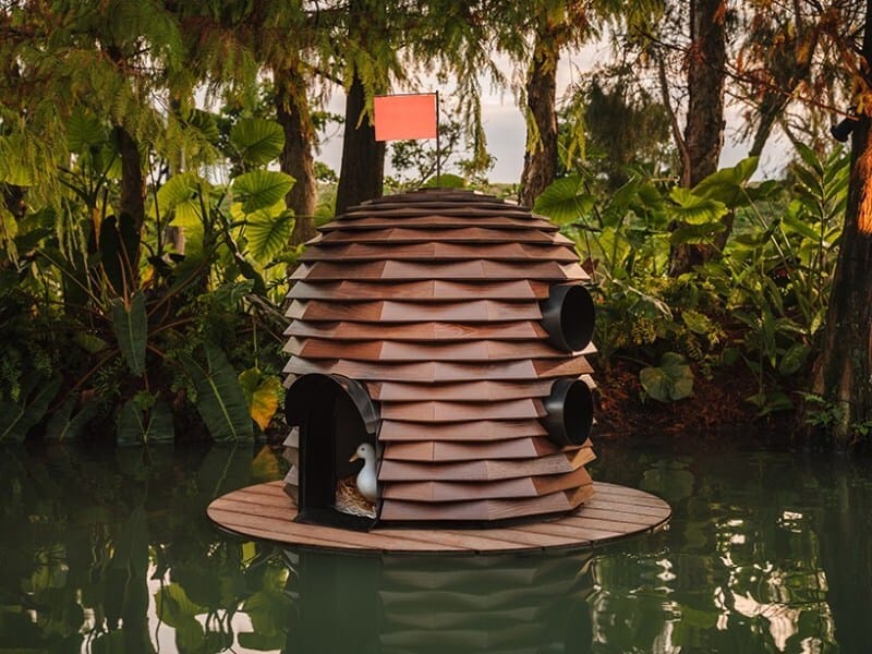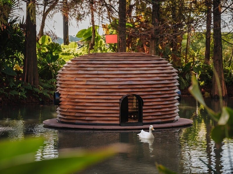 Set on a serene pond at Taiwan’s Swiio Villa Yilan, FENG devised four floating wooden huts, each one a mini pinecone-inspired pavilion, tailored through trial and error to suit the resident call ducks’ tastes.