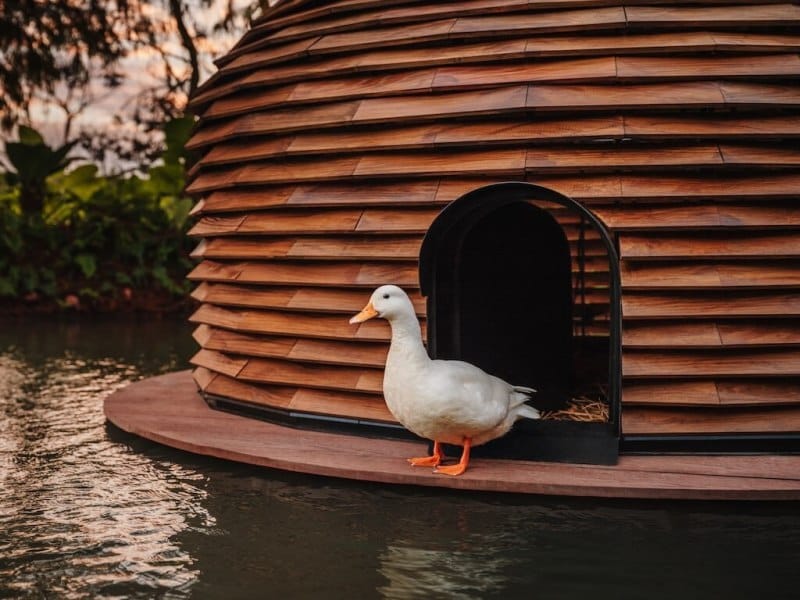 The huts are clad in slanted wooden shingles (chic and practical), varying in size and buoyancy, because ducks have highly specific interior design needs.