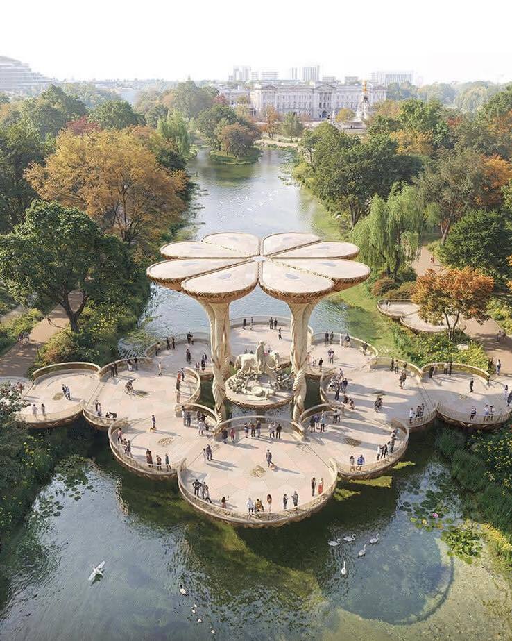 Eight uniquely sculptural lilies surround a sculpture of the Queen, which is located in St James’s Park.
