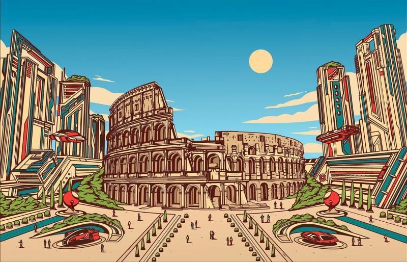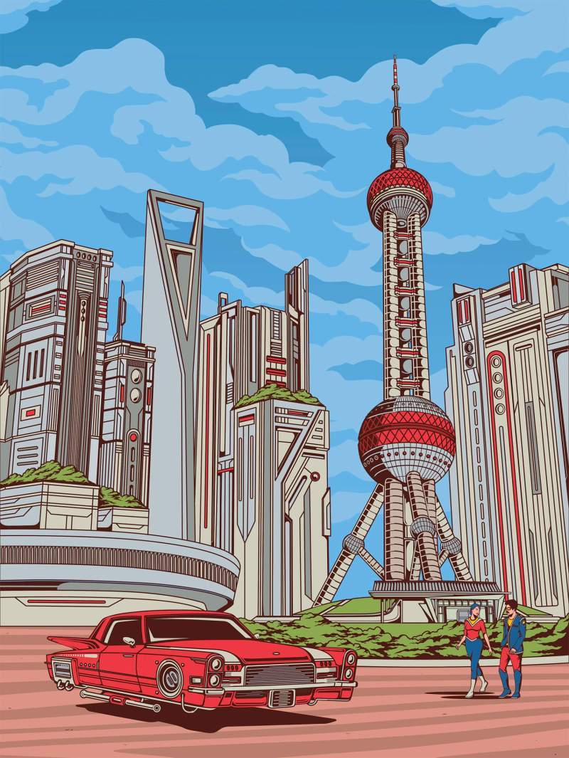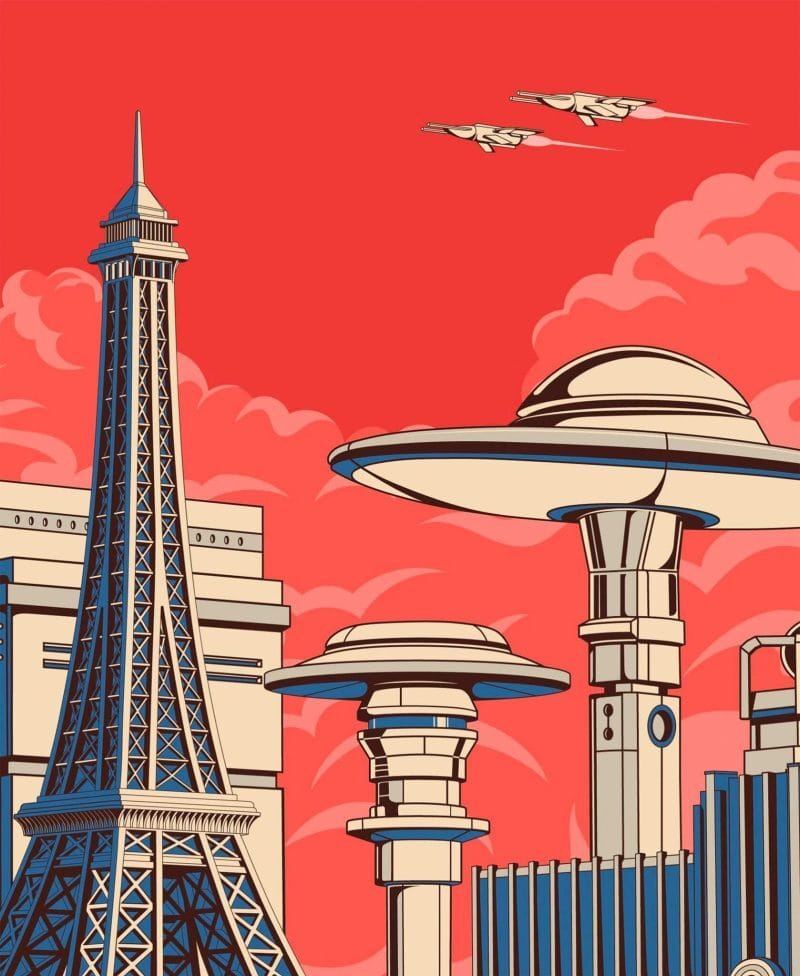 We see Sagrada Familia, the Sydney Opera House, the Eiffel Tower and more in his signature muted colors and flying car aesthetic. Rome’s famous colosseum is surrounded by flying cars and futuristic skyscrapers.