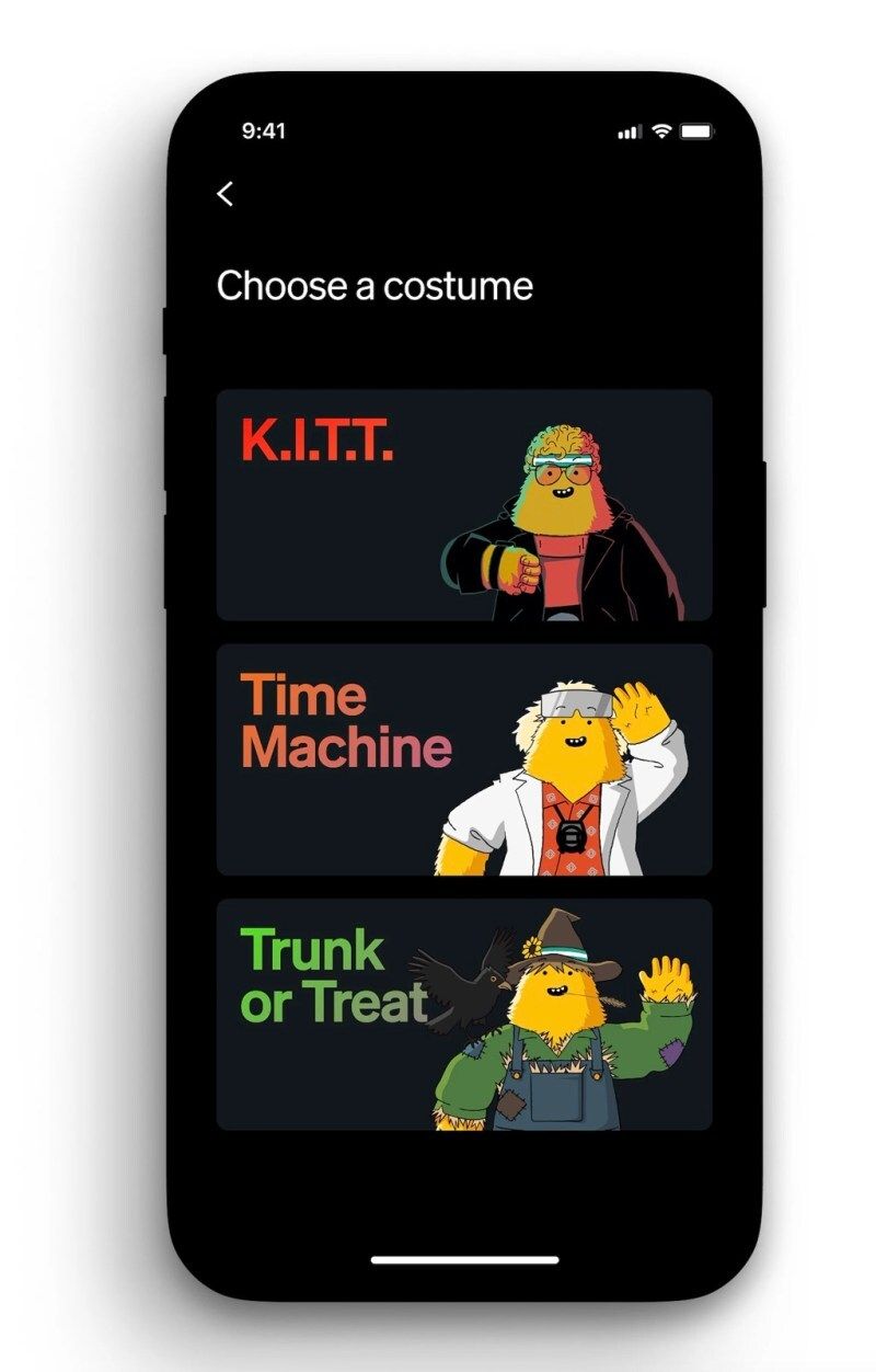 This year’s costumes include K.I.T.T. from the popular Knight Rider show, Time Machine (Back to the Future’s iconic Delorean), and Trunk or Treat, which unlocks all manner of spooky imagery, lighting, and sounds.