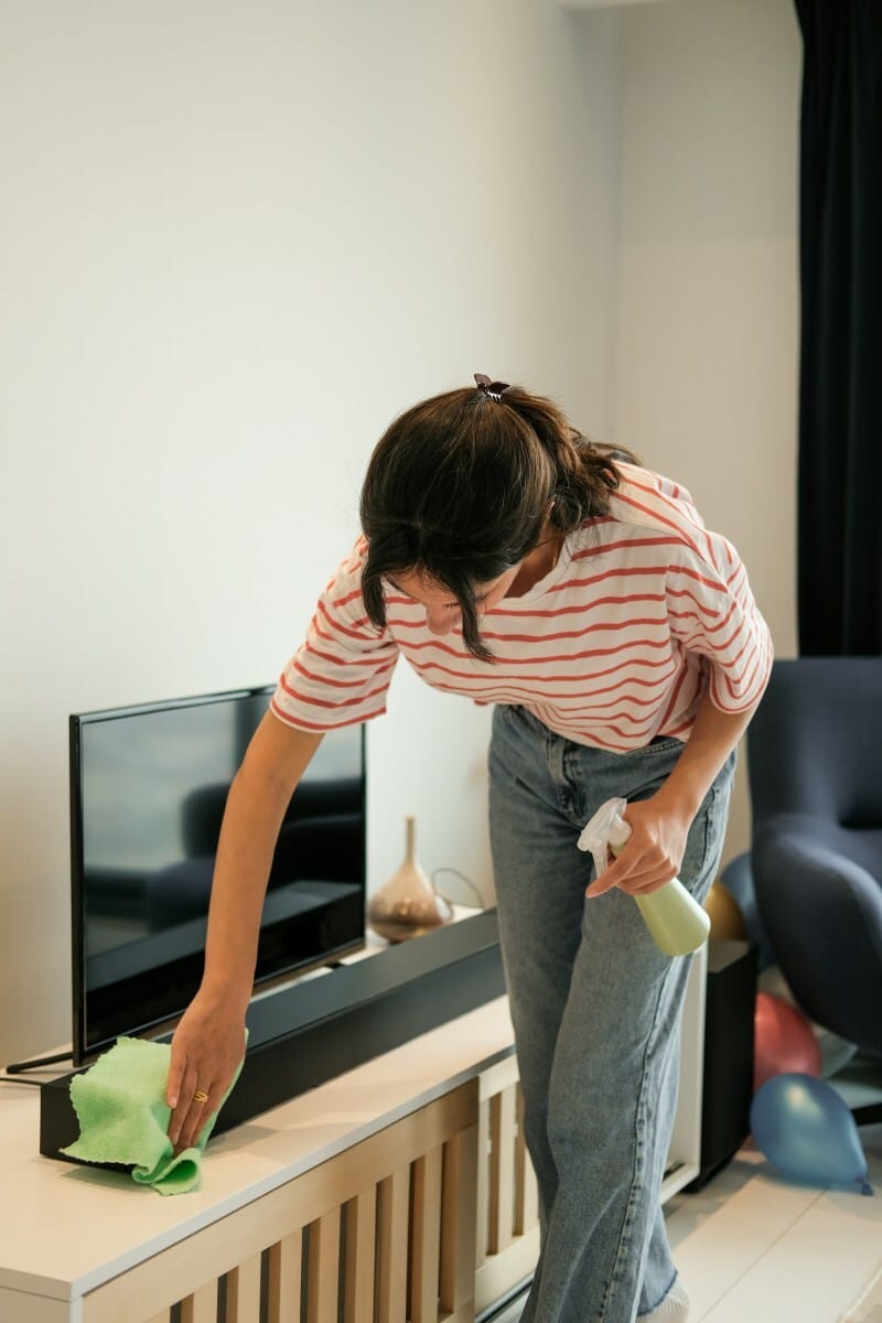 Dust surfaces using a damp microfiber cloth instead of chemical sprays.