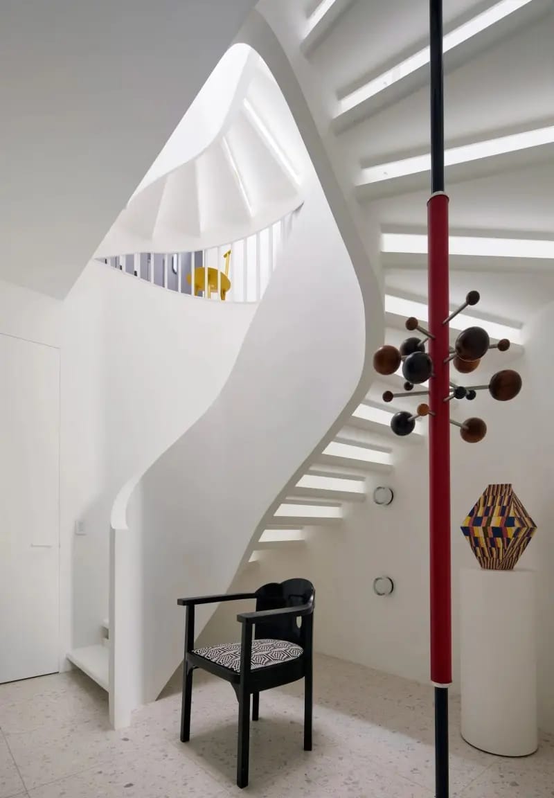 The highly expressive stairway brings light throughout the narrow home, and adds an organic, swooping form to some of the otherwise rectilinear qualities.