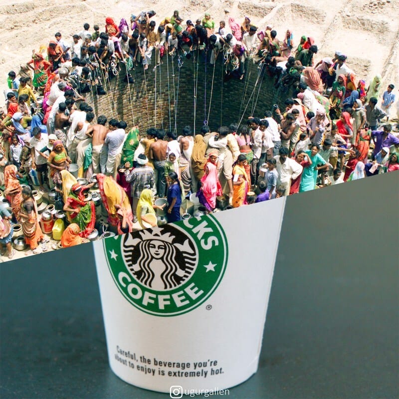 It’s very easy to get wrapped up in small problems and forget to keep a global perspective, to realize how fortunate most of us truly are. These very sobering and insightful juxtapositions by Uğur Gallenkuş give us a taste of that. Using matched objects and perspective, we see wealth, stability, and even opulence paired with the war-torn equivalent, all in one image.