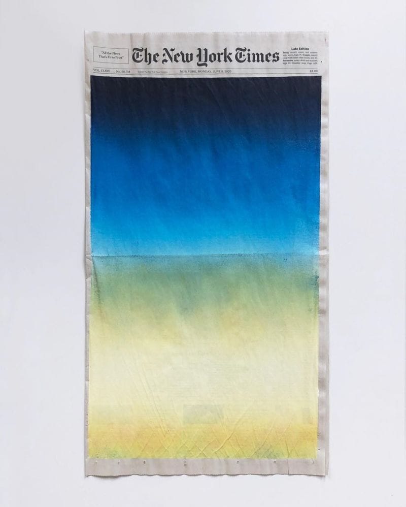 We see a full-length New York Times front cover with a window-sized representation of the day’s sunrise, in beautiful ombré shades of blue, orange and black. A really poignant project, and also a lovely time capsule for an unprecedented 2020.