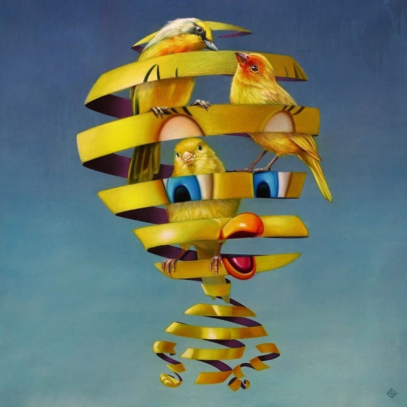 In a series of paintings that beg questions about perception, objectivity and truth, artist Super A shows real world figures trapped within their pop culture shells. Elegantly painted, the pop culture characters are shown weaving around their real world counterparts, in a ribbon-like effect. Snow White’s cartoon exterior hides a real world woman inside. A doe is shrouded by it’s Disney ‘shell’ The result is bizarre and fascinating. Via Colossal:
