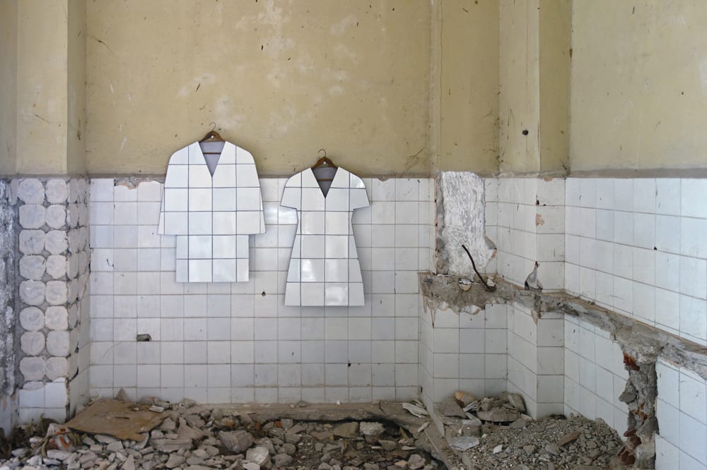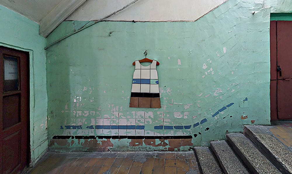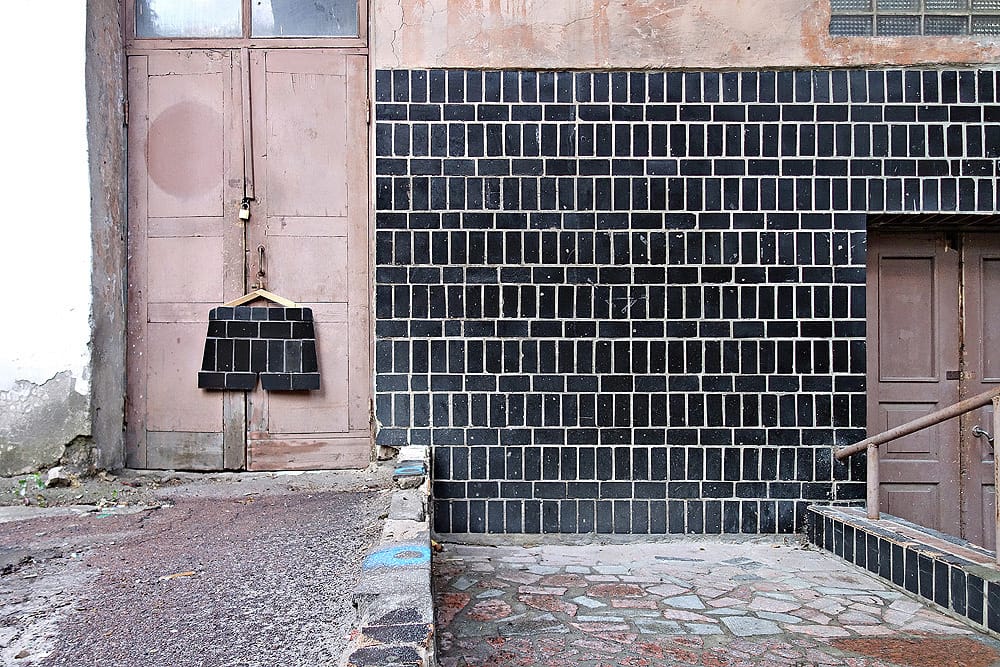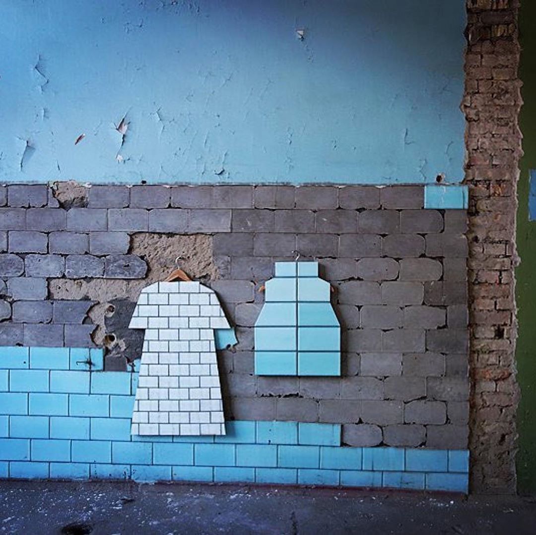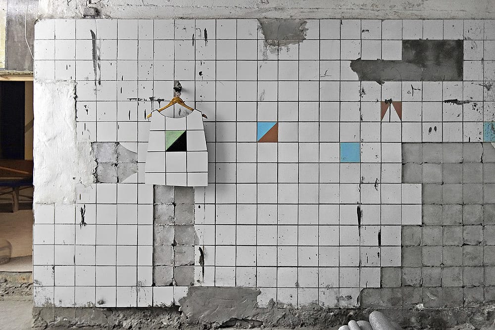 The work of Ukrainian artist Zhanna Kadyrova, she uses found tiles to create her ‘clothing’, hanging it on wooden hangers for extra effect. Via Colossal: