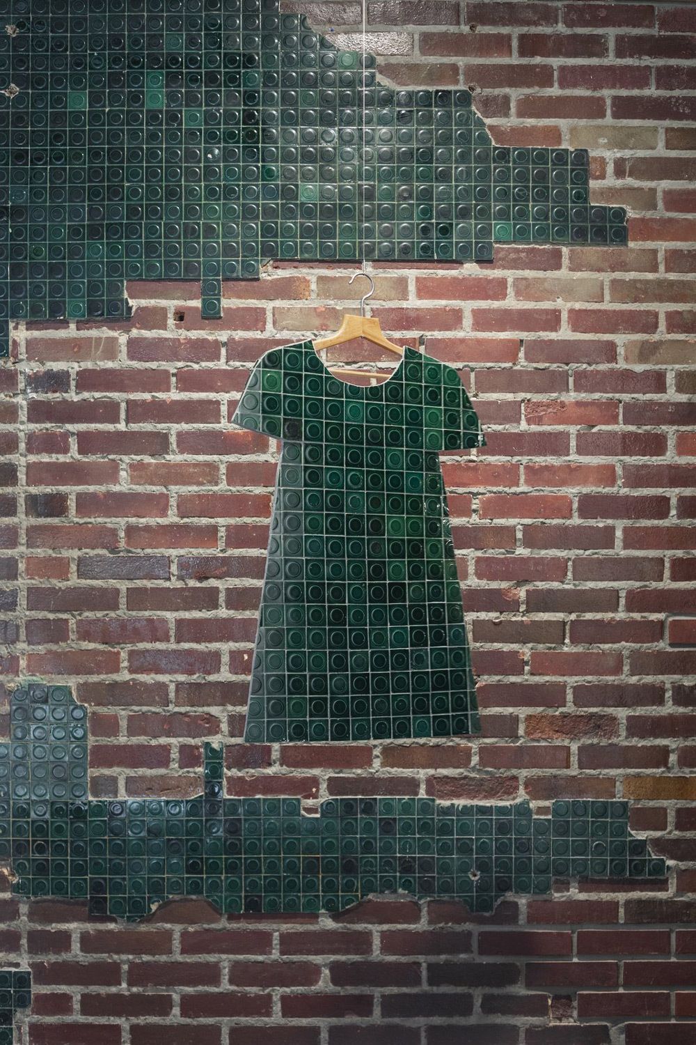 A miniskirt made of blue ceramic. A tank top made of bathroom tile.
