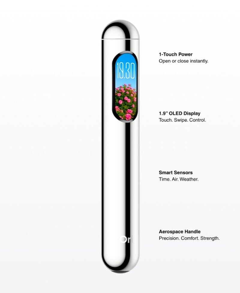 One notable feature of Ori is the small OLED display integrated into the handle or tip of the umbrella. This screen is bright and clear, showing simple graphics or indicators that are easy to read even in dim light or rain.