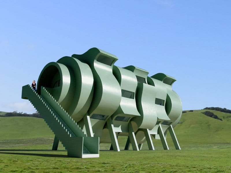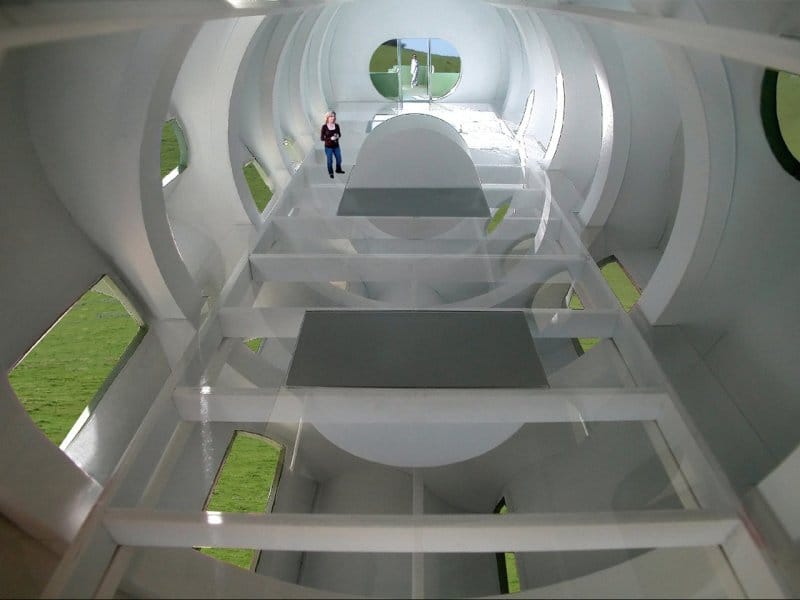 His Interactive Segmented House of the Future is made of five curved sections that rotate around a glass-centered living space, adjusting to sunlight, wind, and season.