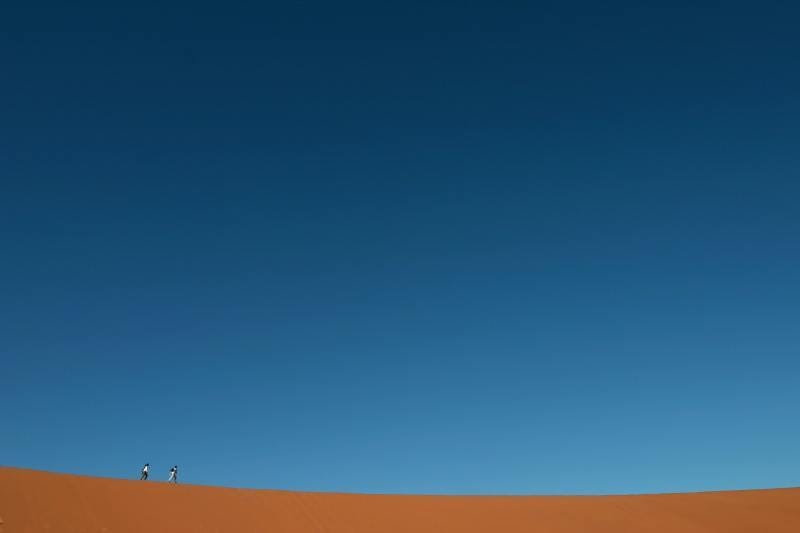 Even though parts of it run right up to the edge of the ocean, the Namib remains extraordinarily dry, due to unique wind currents and topography. This makes for a visually stunning juxtaposition, the blue endless ocean against towering red and orange sand dunes.