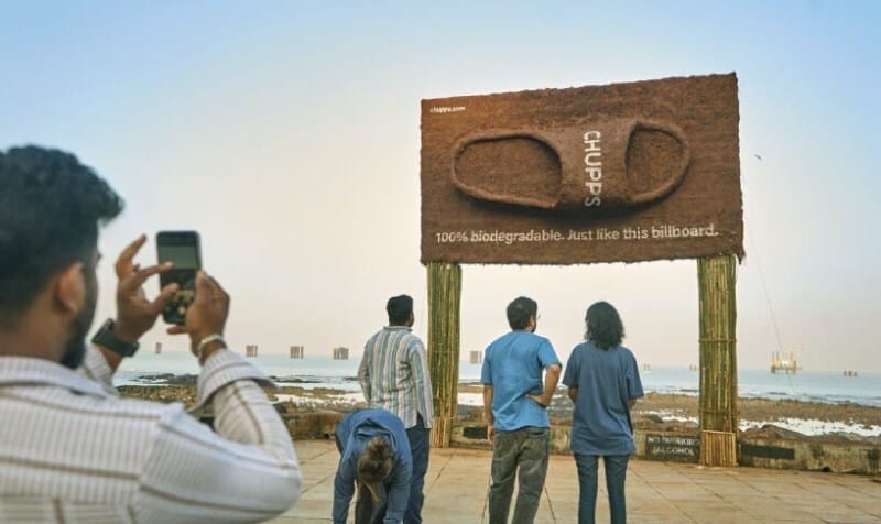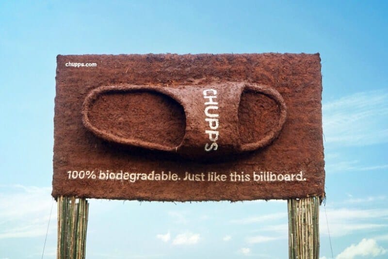To match the eco-friendly nature of their sandals, the brand created a series of biodegradable billboards, made entirely of mud, hay, bamboo, cow dung, and clay.
