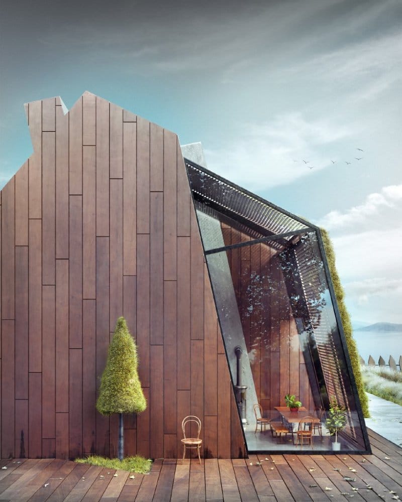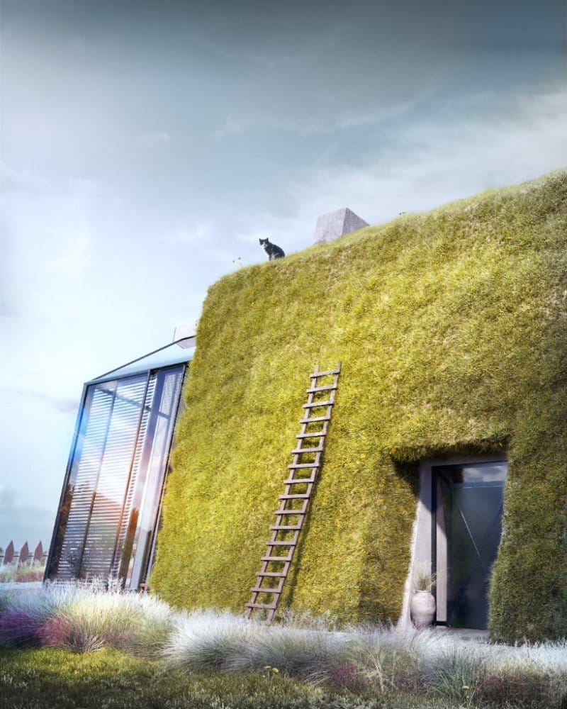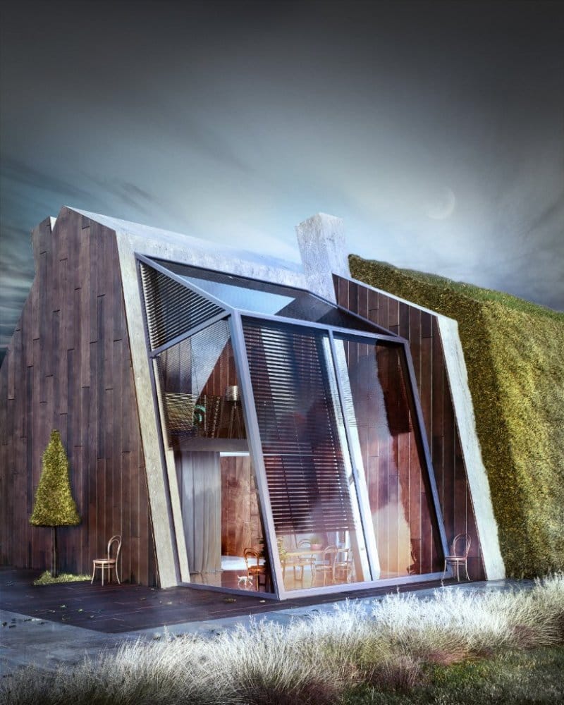 This modern cottage design is the work of Wamhouse Studio, featuring a unique angled design, inset windows, and a green, growing roof.
