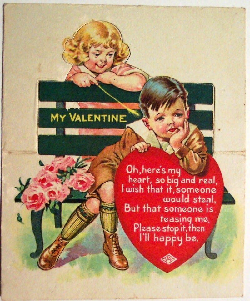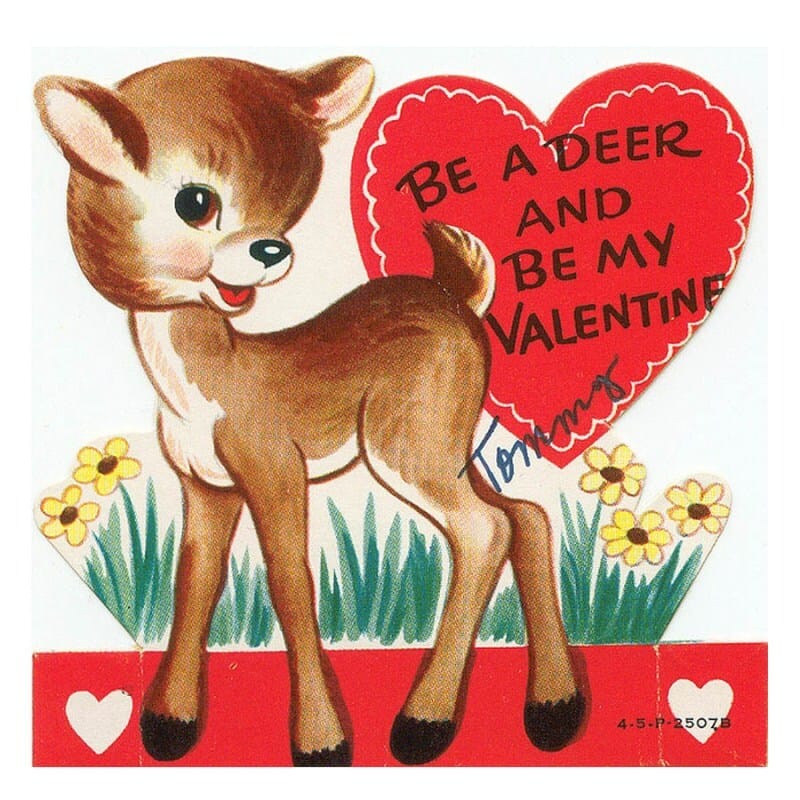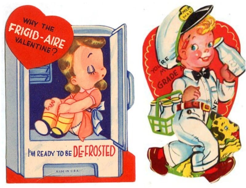 Valentine’s Day means a lot of different things to different people, but there’s a certain level of nostalgia about Valentine’s cards being passed around in school that make us smile. This collection of vintage Valentine’s might be before our time, but the sentiment is cute, corny, and nostalgically delicious. Mostly from the 1940’a, note the heavy use of puns throughout the cards, almost like the cornier the pun, the sweeter the sentiment. Via The Anastasia Company: