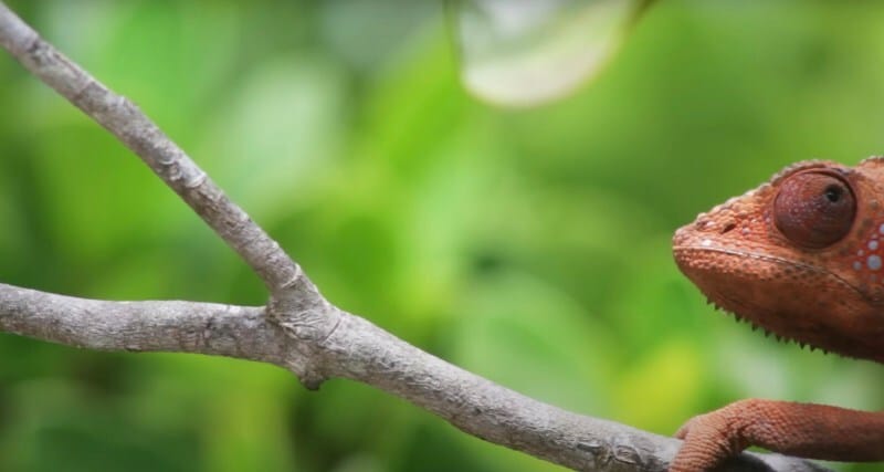 In a high-definition video, we see a timid, wild chameleon in Madagascar inch along a branch.