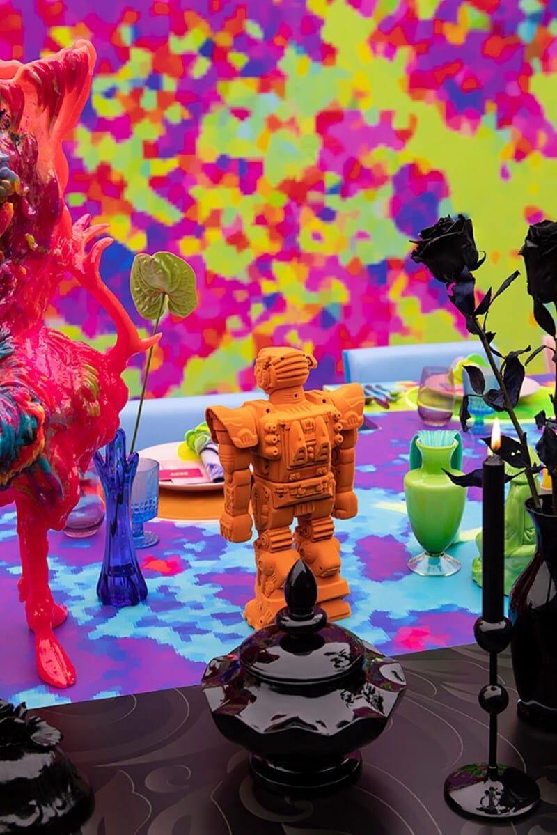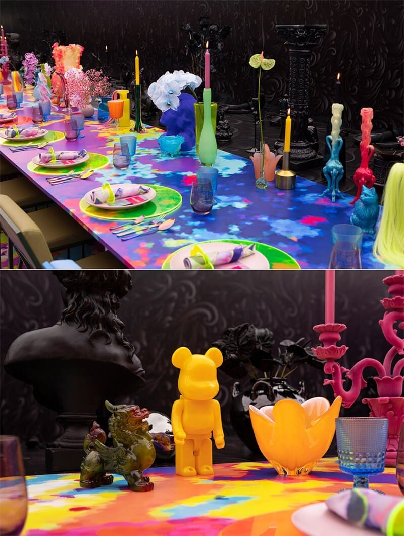 We appreciate a creative party, and as wedding receptions go, this black and color party by Von and Ryan Bishop sets a new bar for design and execution. A long room was completely transformed to be half black, and half wild color, representing the dual personalities of the couple. Everything from the walls to the table to the place settings followed this strict dichotomy, to mesmerizing effect.