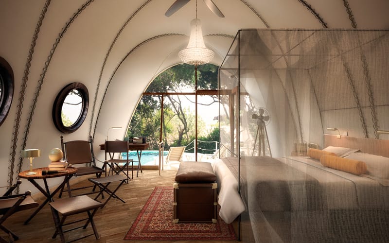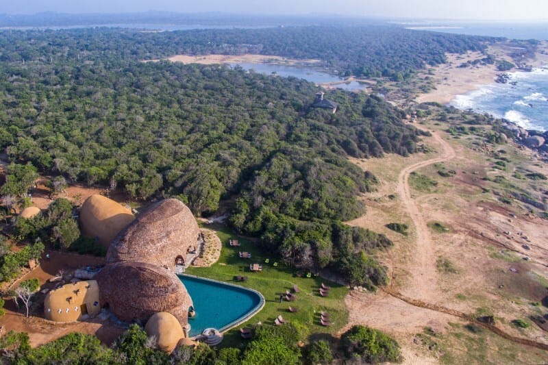 Wild Coast Tented Lodge is a scenic retreat in Sri Lanka on the Indian Ocean. Consisting of 36 domed ‘tents’, the resort is a five-star beauty, complete with teak floors, copper tubs, and poolside bar.