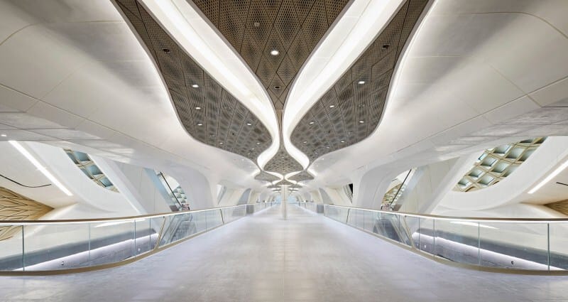 True to ZHA’s style, the design features fluid, wave-like forms that guide passengers naturally through the space. The structure feels alive, balancing bold geometry with human-centered flow.